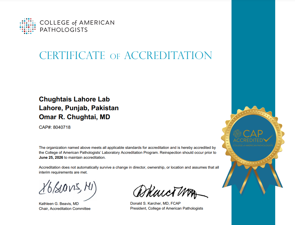 Our Central Lab in Lahore is accredited by the College of American Pathologists. The Central Lab operates 24/7, and is home to all of our specialized technical departments.